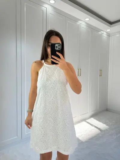 FİSTOLU İCİ ASTARLI BEYAZ ELBİSE S M L BEDENLERDE